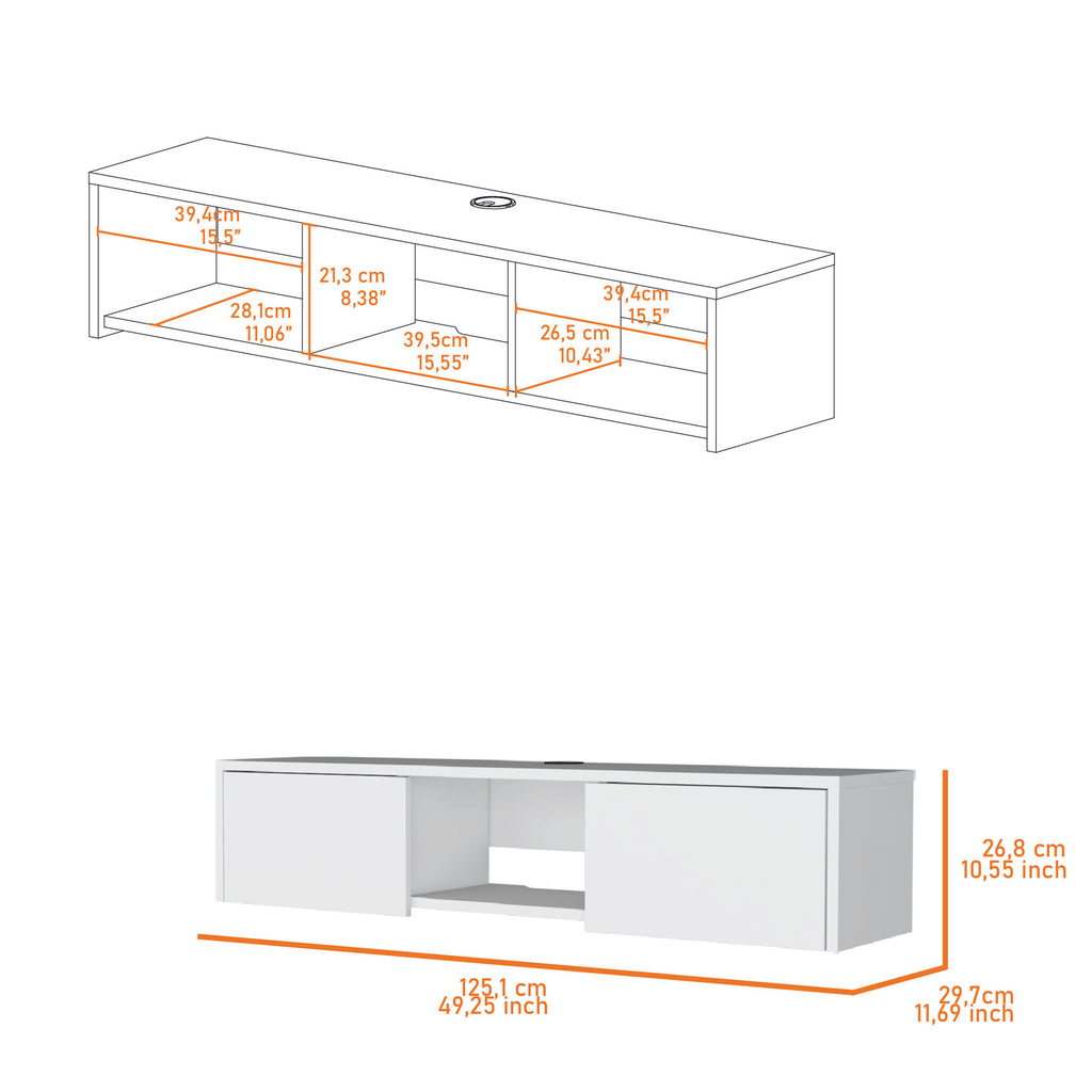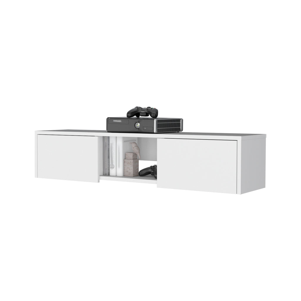'The Tabor Floating TV Stand offers a minimalist and space-efficient design in a sleek white manufactured wood finish. Wall-mounted for a clean look, it features two side doors (15.5''W x 8.3''H) for hidden storage and a central open space (15.5''W x 8.3''H) for consoles, all with convenient cable management. This stylish unit is ideal for modern living spaces, balancing functionality with contemporary elegance.