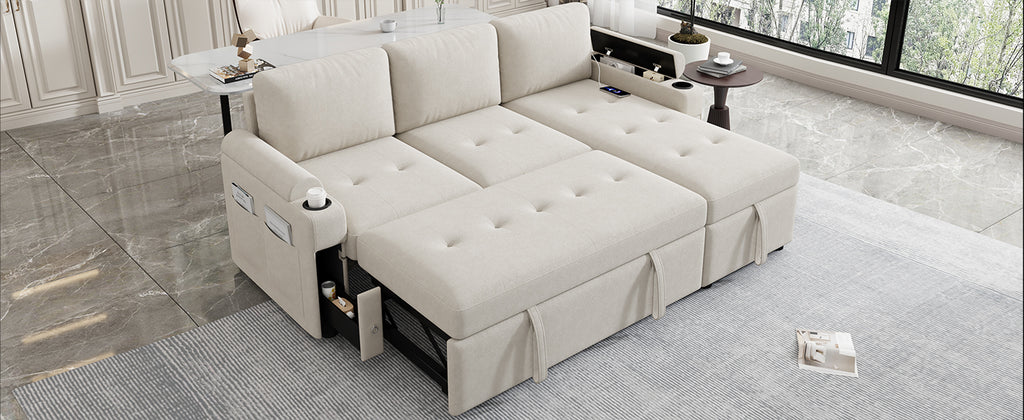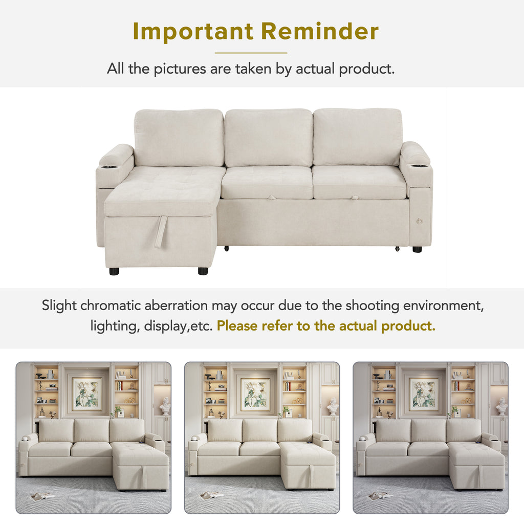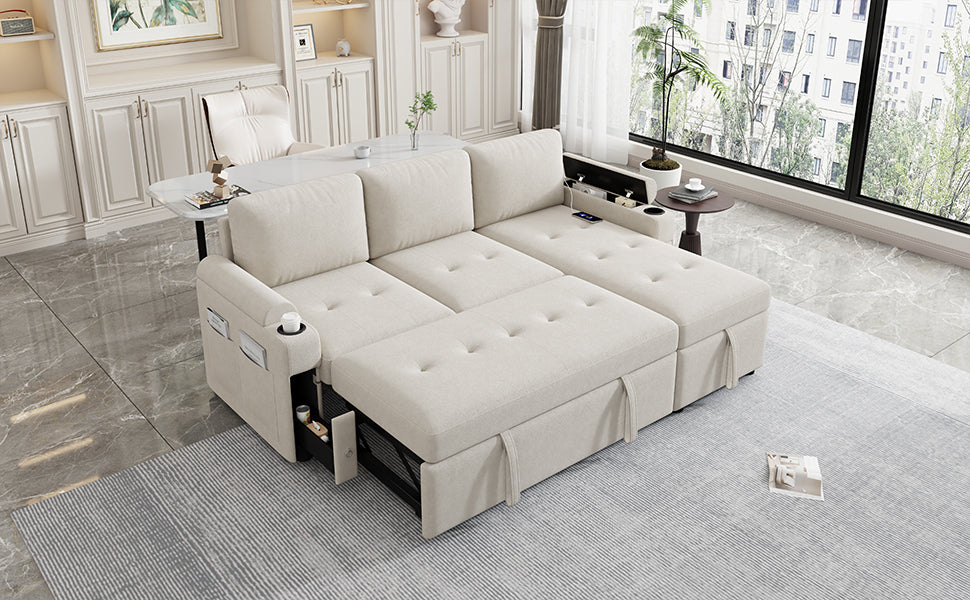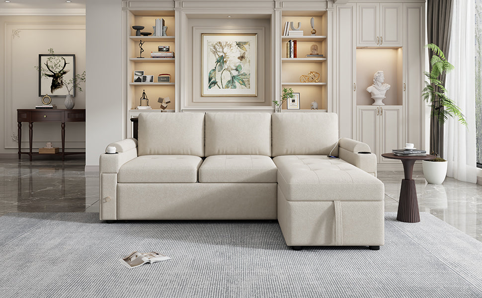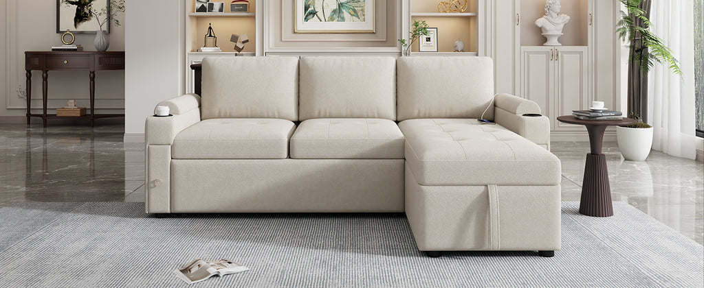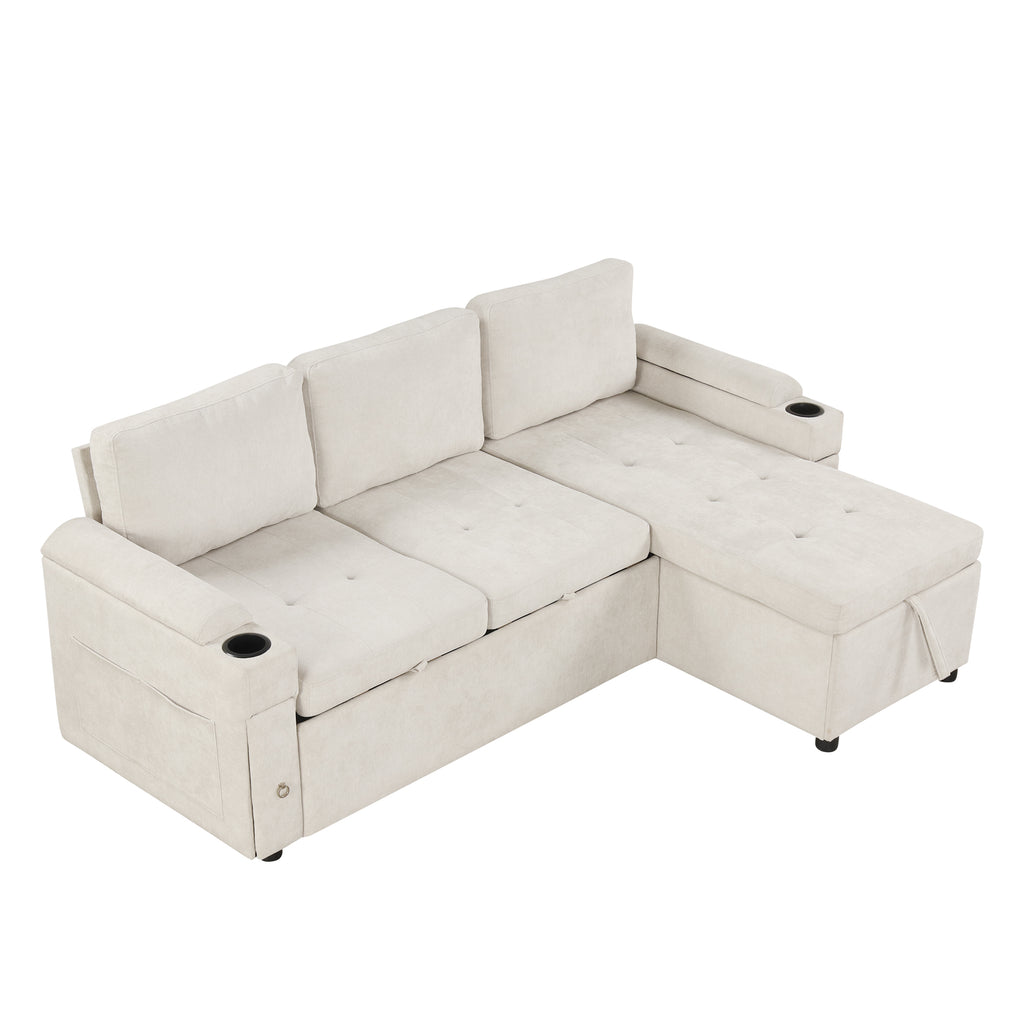 This versatile L-shaped sofa offers a perfect blend of style, comfort, and functionality. Featuring a reversible chaise lounge, it allows you to easily adapt the configuration to suit your space and preferences. The sofa provides ample storage with hidden compartments in the chaise, armrests, drawers, and side pockets, helping you keep your living area organized. It also transforms effortlessly into a sofa bed, offering a convenient sleeping area for guests. Equipped with two cup holders and two USB ports, it ensures maximum convenience for relaxing and staying connected. Crafted with soft chenille fabric, high-density foam, and a sturdy frame, this sofa guarantees long-lasting comfort and durability, making it an ideal choice for modern, dynamic living spaces.
