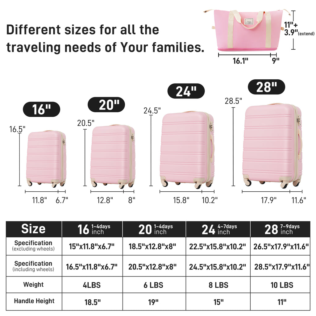 - [Include]Expanable Spinner Wheel 4 Piece Luggage Sets ABS Lightweight Suitcase with TSA Lock 16'+20'+24'+28' Luggages & 1 Travel Bag & 8 Luggage Storage Bags & 4 Luggage Tags