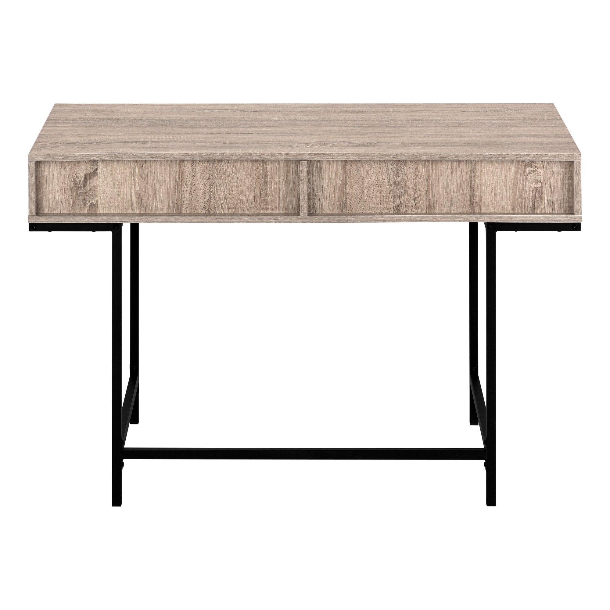 - Metal base in a black finish provides stability and includes slender metal legs that are recessed under the rectangular desktop
