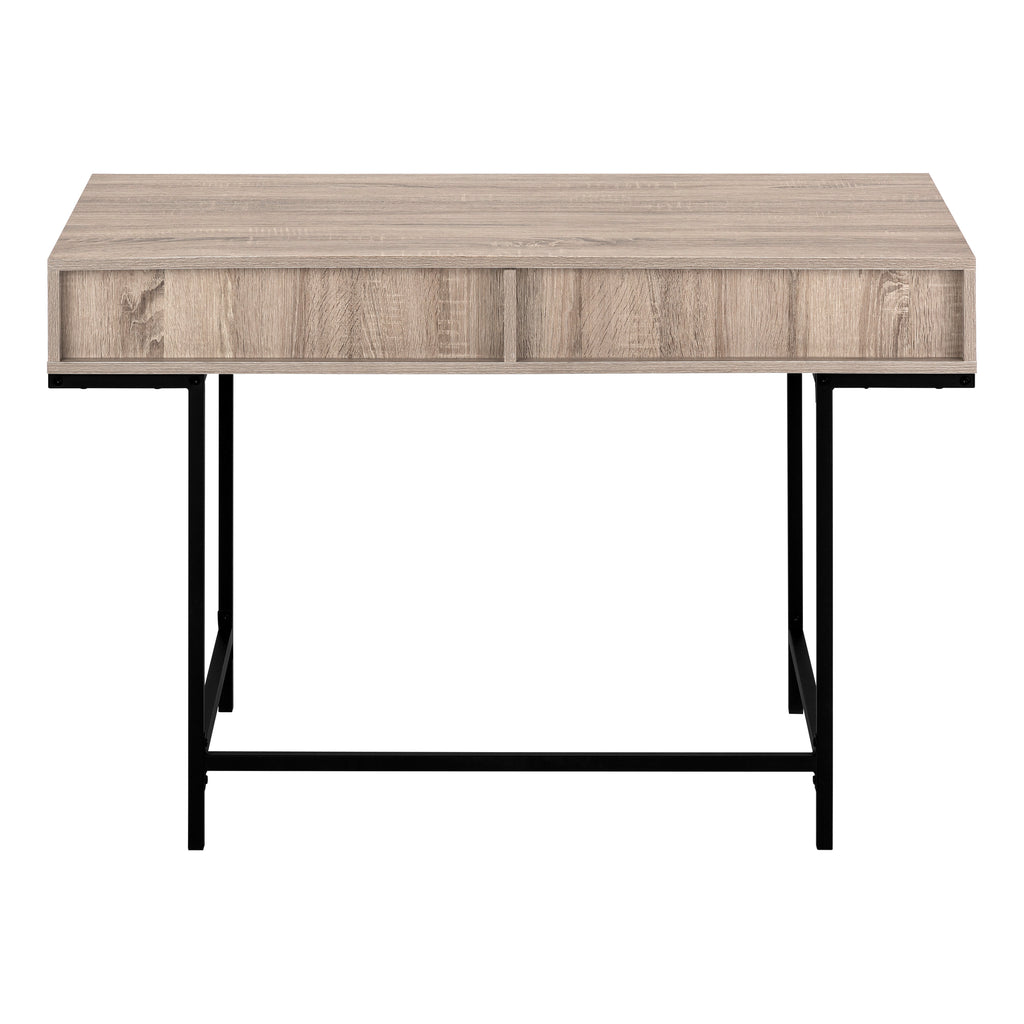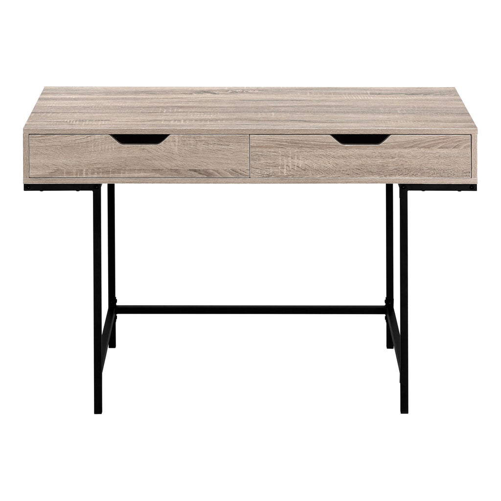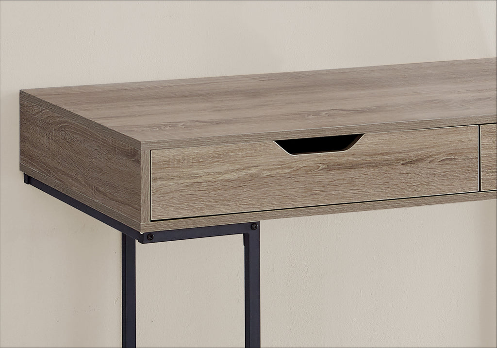- Computer desk in a dark taupe wood-look finish with 2 storage drawers featuring wide, cutout handles and metal drawer slides