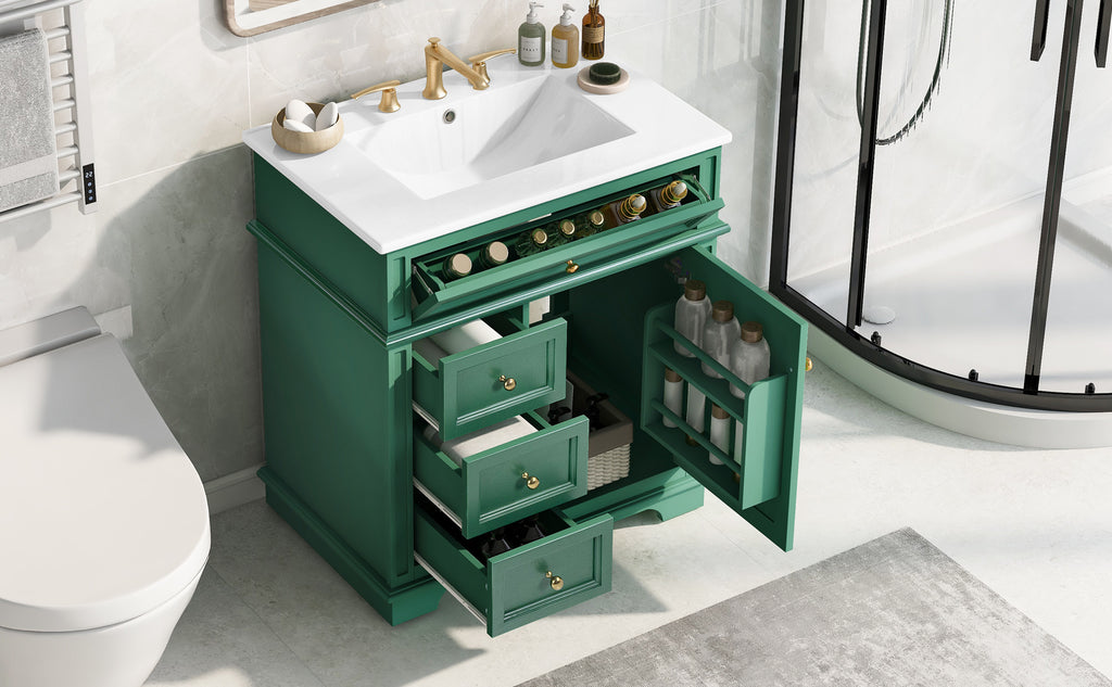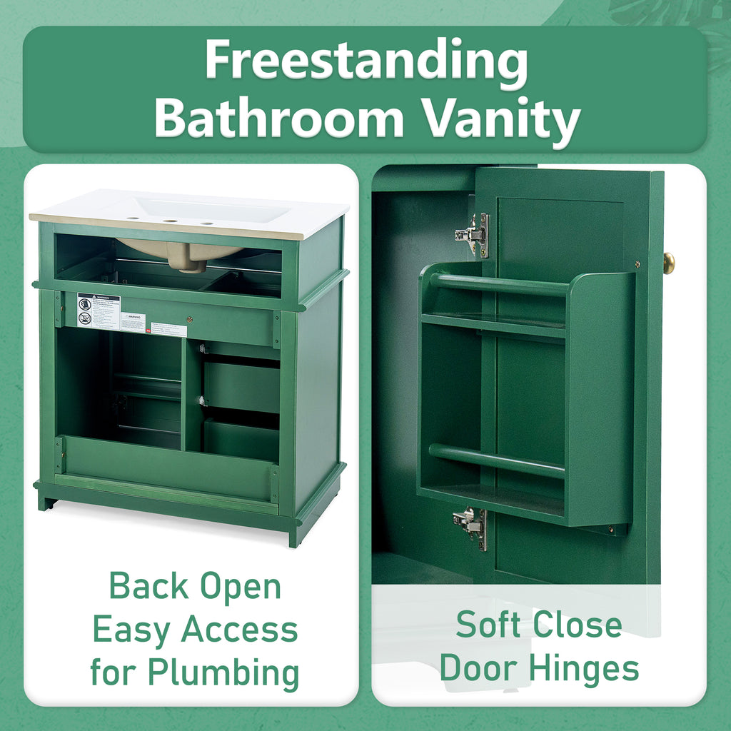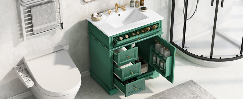 - Vanity with Cabinet & Door Shelf & Drawers: This bathroom vanity has ample storage space: one cabinet with door shelf, one big tip-out drawer and 3 drawers with silde rails. You can put soaps, towels, shampoos, tissue paper and other bathroom essentials in it so to keep them away from dust.