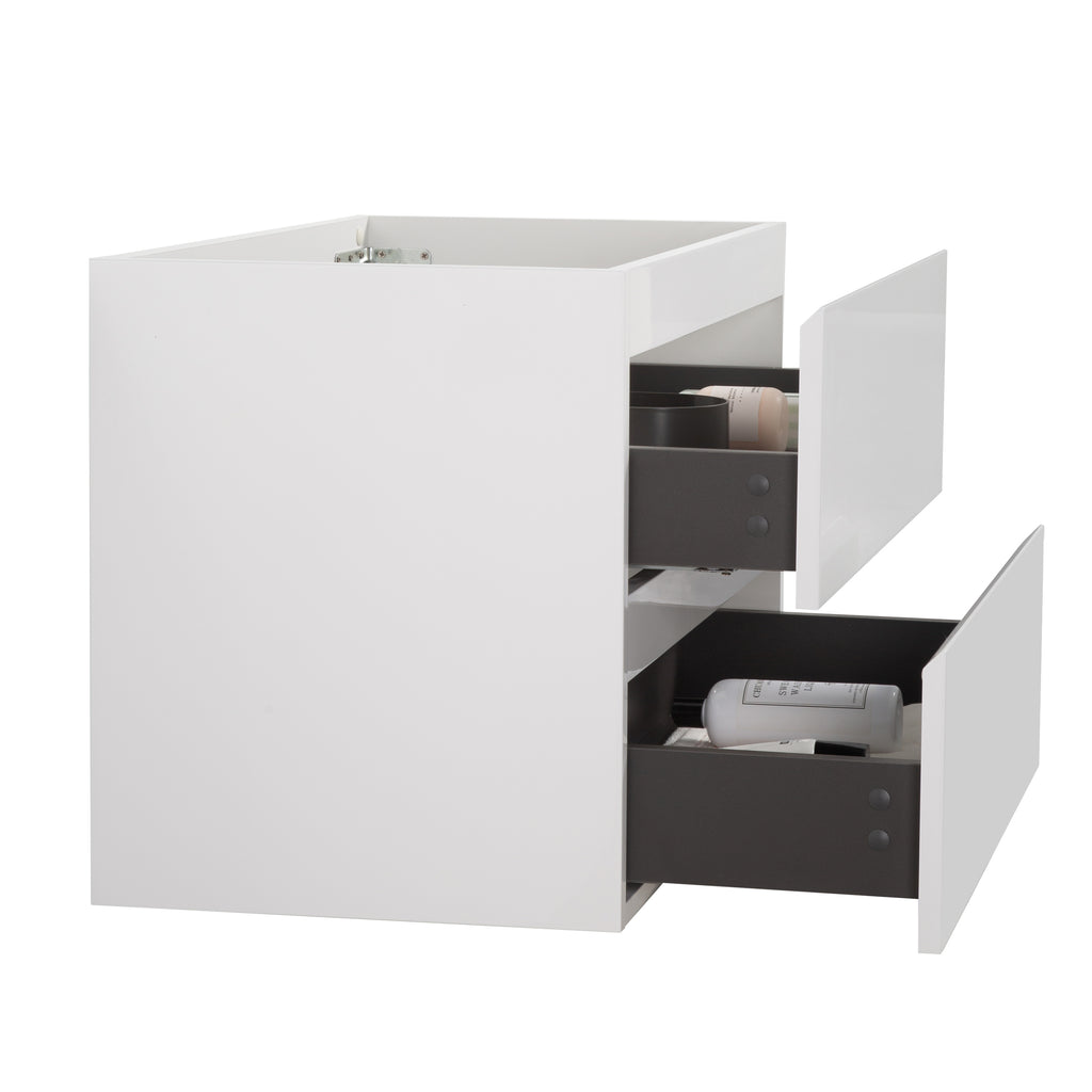 Alice's double drawers maximize the use of space, offering a 20% increase in storage capacity to keep your bathroom essentials organized and within reach. And thanks to the DTC soft-closing silent drawer runners, you can enjoy a serene environment, free from disruptive noises. Featuring an integrated 45° sloping handle-free design, Alice embraces a minimalist approach to design. The sleek white cabinet enhances the visual appeal and creates a seamless look, adding a touch of modern refinement to your bathroom.