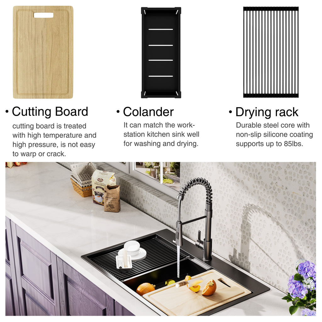 - Gunmetal black drop-in workstation kitchen sink boasts a large capacity, designed to hold items like stockpots and baking sheets, providing great convenience in your daily use.