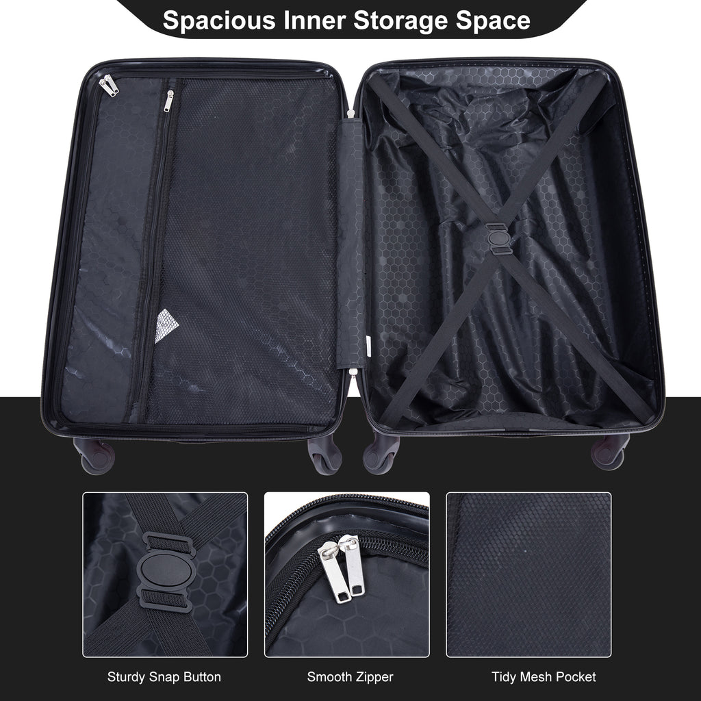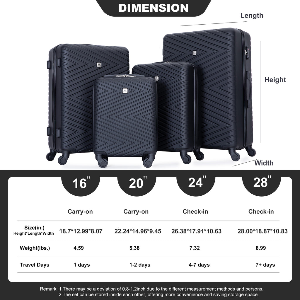 - Four luggage bags, 16 inches and 20 inches, can be carried with you, and 24 inches and 28 inches can be checked in. They can be placed inside each other, providing more convenience and saving storage space.