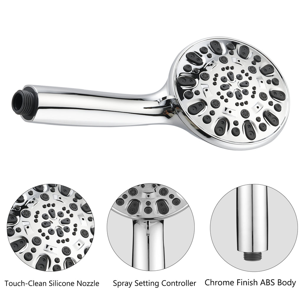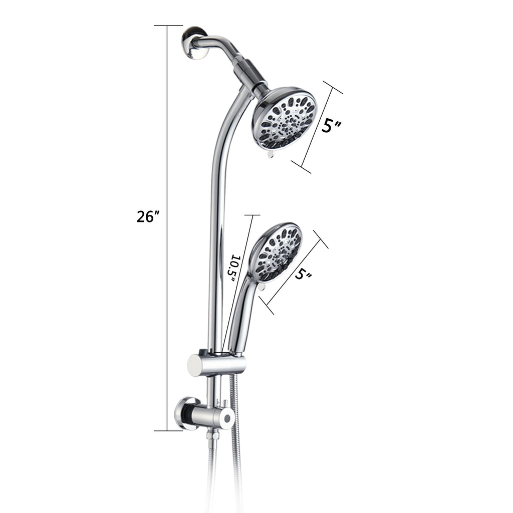 - 26' drillless stainless steel sliding rod assembly, equipped with 5-inch plastic ABS shower head, manual shower and low water level tee diverter, easy to operate.