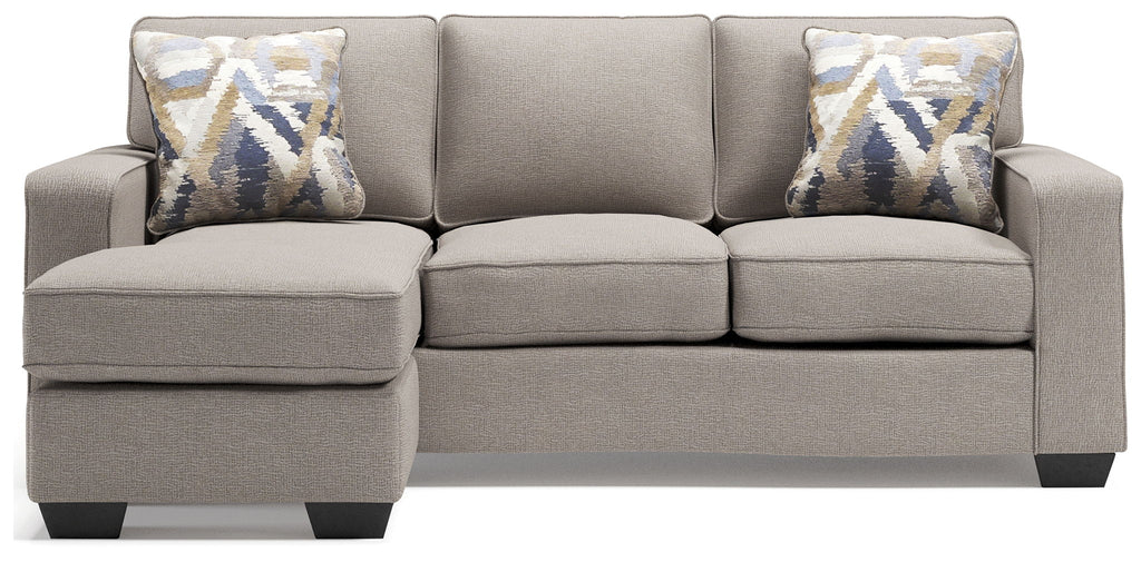 Make your living space that much more livable with this sofa chaise. You—re sure to love its L-shaped design that makes it all too enticing to kick up your heels and relax. The fact that this sofa chaise can be positioned with the chaise on the right or the left only adds to its appeal. And you can rest assured that its ultra-neutral upholstery with a textural chenille feel goes with anything and everything. Wide track armrests, box cushions and tapered feet lend a clean, contemporary aesthetic.