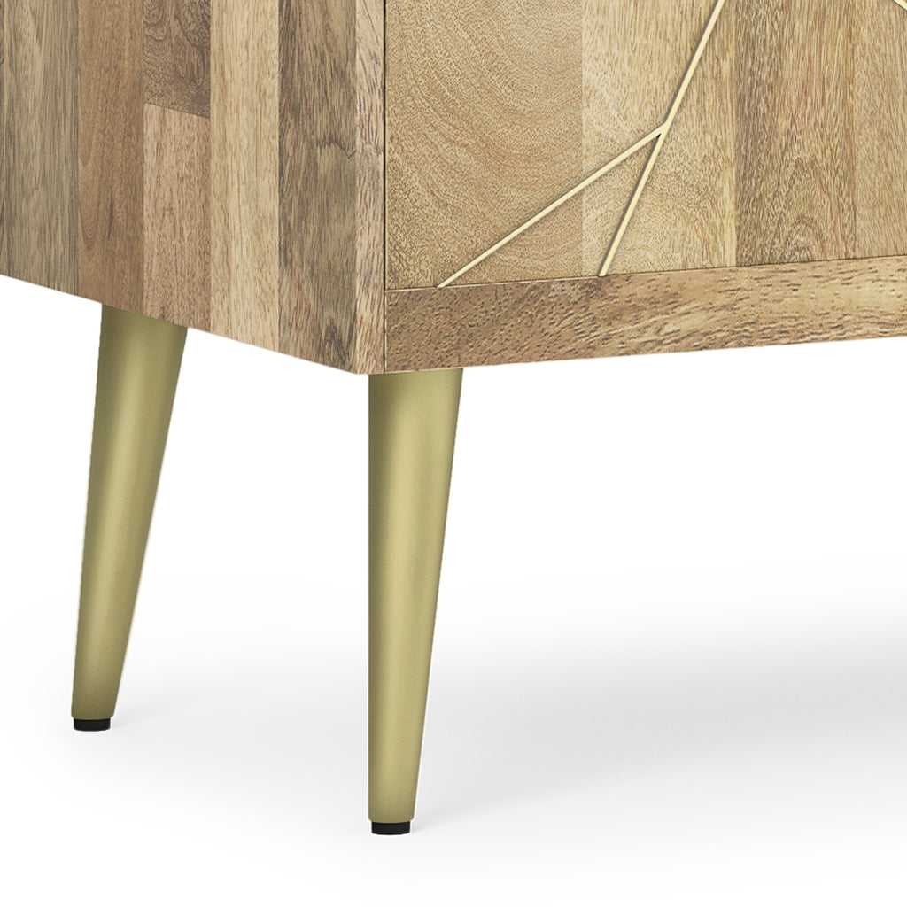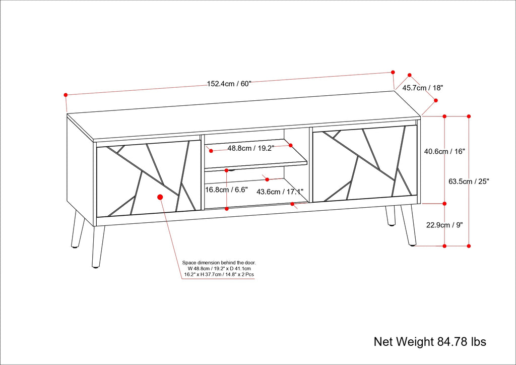 - TV Stand is perfect for TVs up to 65 inches, showcases a unique geometric brass metal inlay and four gold finished metal legs