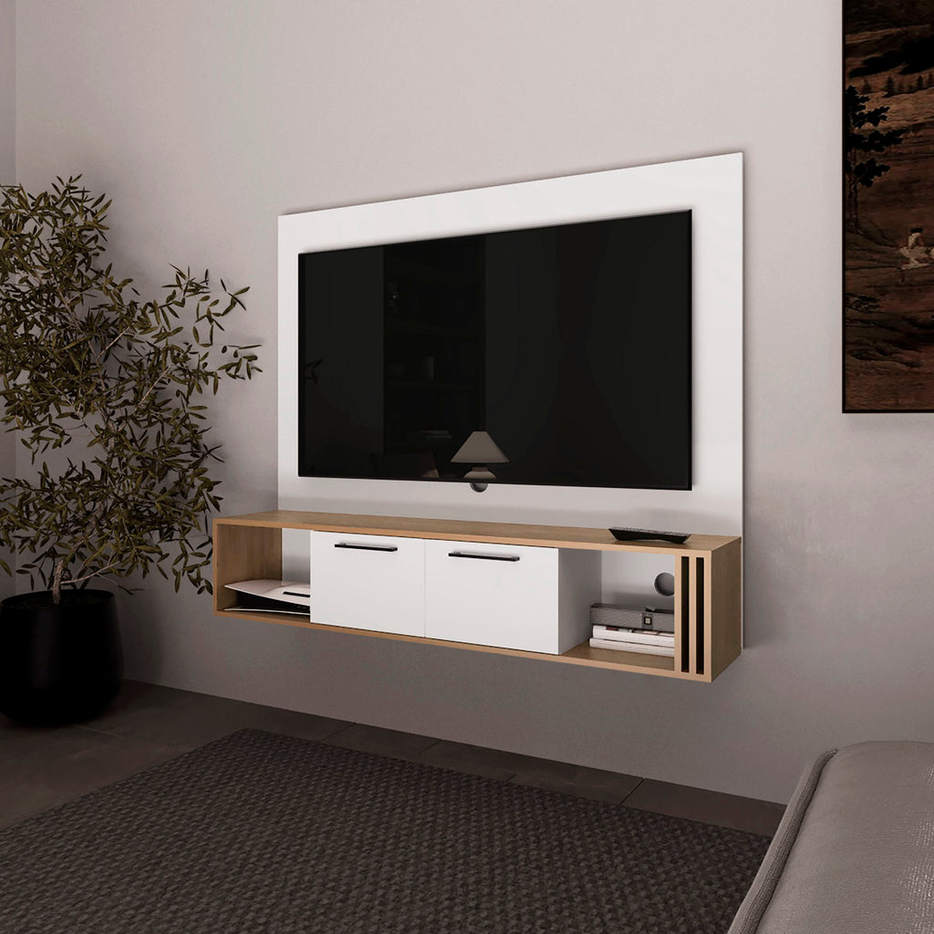 'Wall-Mounted Entertainment Center with Storage Cabinets and Cable Management, Modern Design Elevate your living space with this stylish wall-mounted entertainment center, designed to create a sleek and organized look. Featuring a spacious back panel with pre-drilled cable management holes, this unit ensures a clean setup for your TV and electronic devices. The lower section includes multiple storage compartments with doors, providing ample space to hide away media accessories, remotes, and more. Open side shelves offer additional room for decorative items or books. Crafted from durable materials, this entertainment center is easy to install and perfect for modern or minimalist interiors. Materials: Particle board and melamine. Dimensions: 47,2'' (H) x 56,1'' (W) x 12,4'' (D).'''