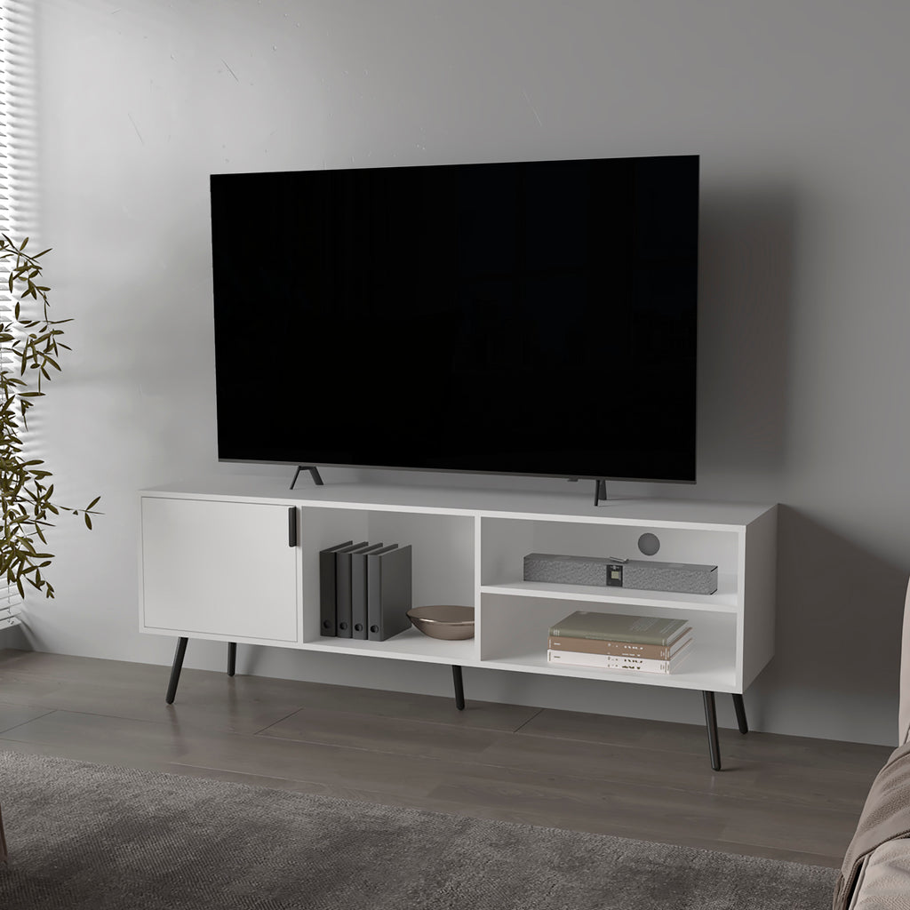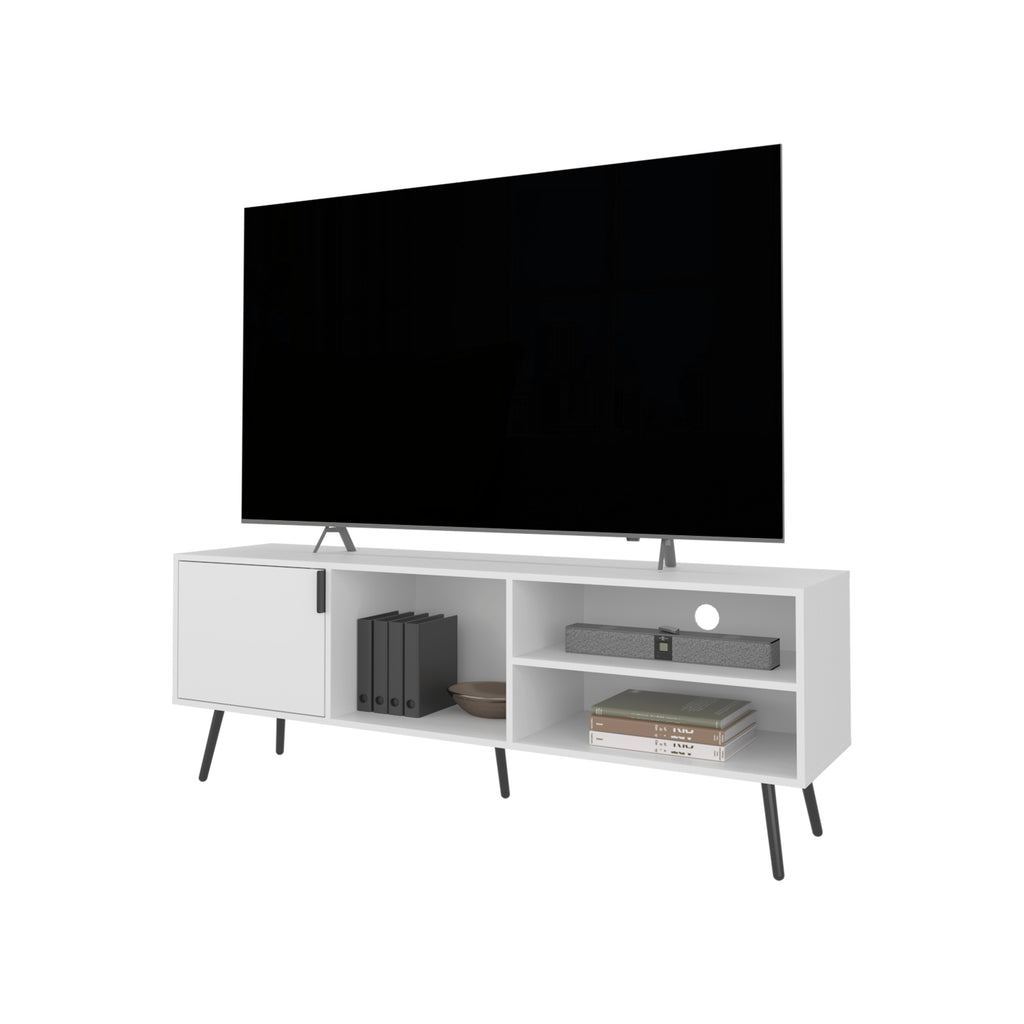 'Minimalist and modern entertainment center designed to bring functionality and style to any living room. This multistorage unit features three open compartments and a side space with a door, ideal for organizing electronic devices, remotes, and decor. The conical legs add a touch of elegance and stability, and the structure provides secure support for large TVs. Its clean and versatile design makes it perfect for keeping the entertainment area organized and visually appealing. Materials: Particle board and melamine. Dimensions: 22,8'' (H) x 63'' (W) x 15,7'' (D).'