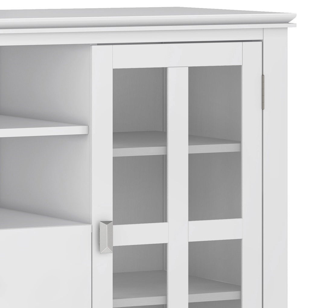 - Features two (2) central drawers with metal glides, open center area with adjustable shelf and two (2) side tempered glass framed doors that open to large storage spaces with two (2) shelves each