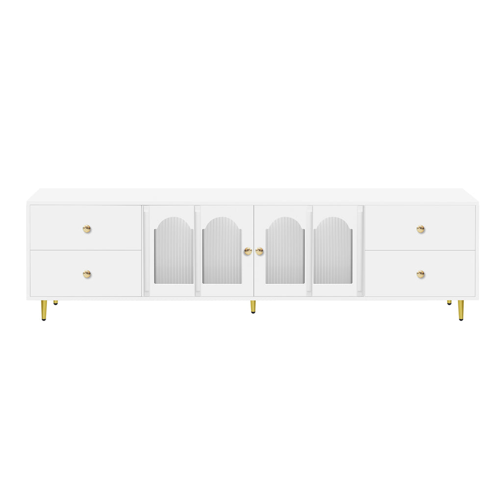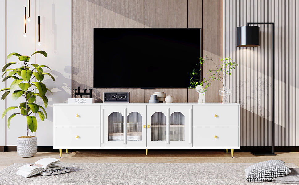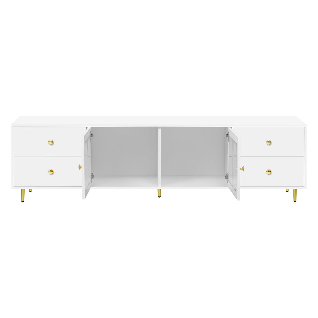 Elegantly designed and immensely practical, this TV stand stands out as a remarkable addition to any living room or entertainment space, boasting an impressive array of features that seamlessly blend functionality with aesthetic appeal. Spacious and well-organized, it offers four ample drawers and a roomy cabinet, providing sufficient storage capacity to accommodate all your entertainment essentials with ease, while its discreet storage solutions ensure clutter remains hidden, preserving a tidy and streamlined appearance. Stylish and sophisticated, the round gold handles on the drawers and the ergonomic long handles on the cabinet doors not only facilitate smooth operation but also elevate the overall aesthetic, contributing to a cohesive and elegant look. Complementing the handles, five metal legs add a touch of harmony and refinement, creating a visually pleasing and unified design. Elegantly transparent, the glass doors introduce a sense of sophistication and enhance the decor, adding a touch of modernity to the setup. Thoughtfully engineered, the cable management holes on the back of the cabinet keep cables and wires neatly tucked away, maintaining a clutter-free and organized environment. Lastly, user-friendly and straightforward, this TV stand is incredibly easy to assemble, thanks to the inclusion of clear and detailed instructions, making it an ideal choice for anyone seeking a stylish and practical storage solution for their living space.