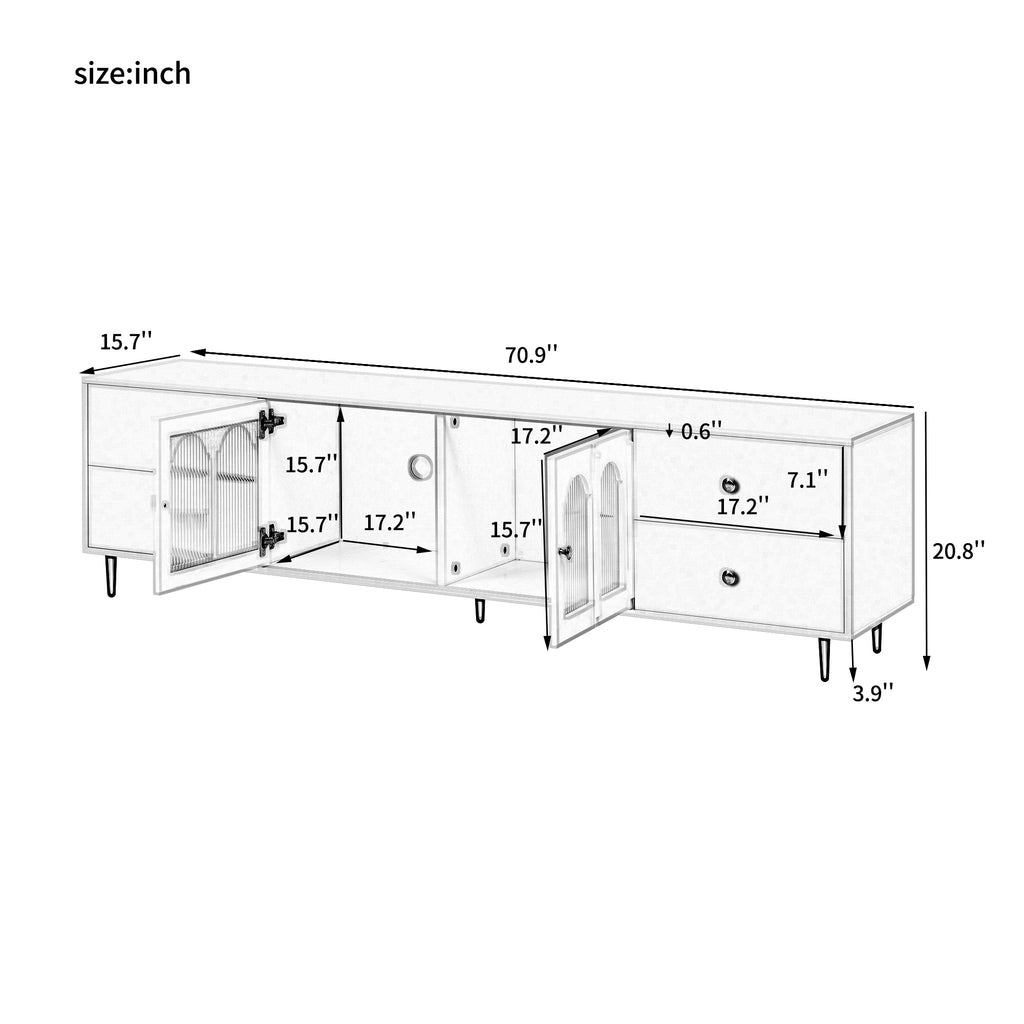 - Equipped with four drawers and two spacious cabinets, this TV stand offers ample space for easily storing all your entertainment essentials. Whether it's DVDs, gaming consoles, or audiovisual equipment, the cabinets provide discreet storage solutions that keep clutter at bay, ensuring a clean and organized living space.