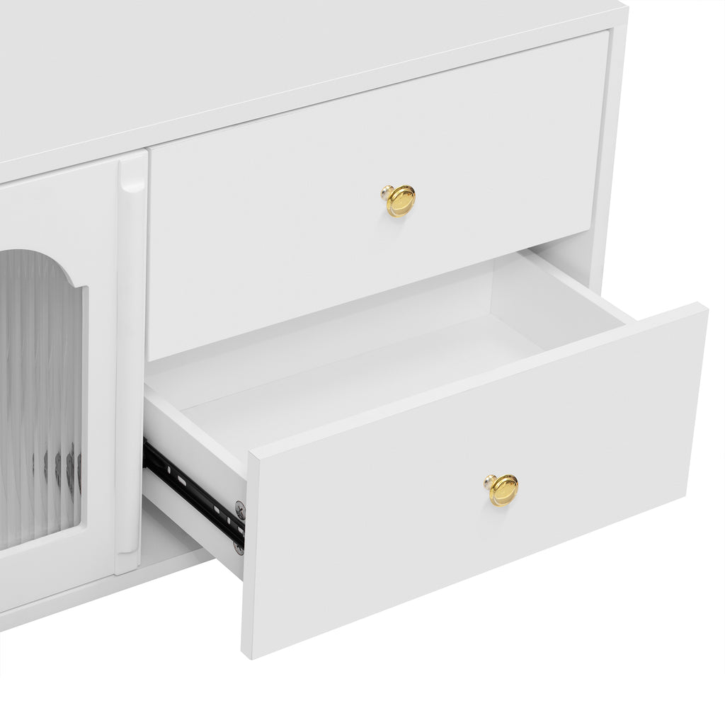 - Each drawer and cabinet door is furnished with a round gold handle. These are meticulously designed to enhance the overall aesthetic of the cabinet. The gold finish on the legs matches the handles, ensuring a harmonious and elegant appearance. Additionally, the glass doors add a touch of elegance, elevating the decor of any living room or entertainment space.