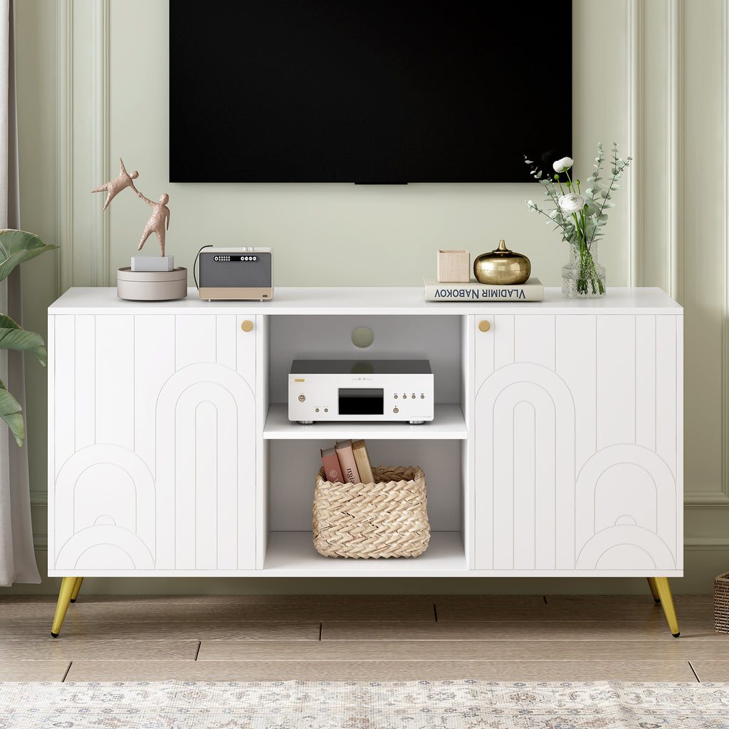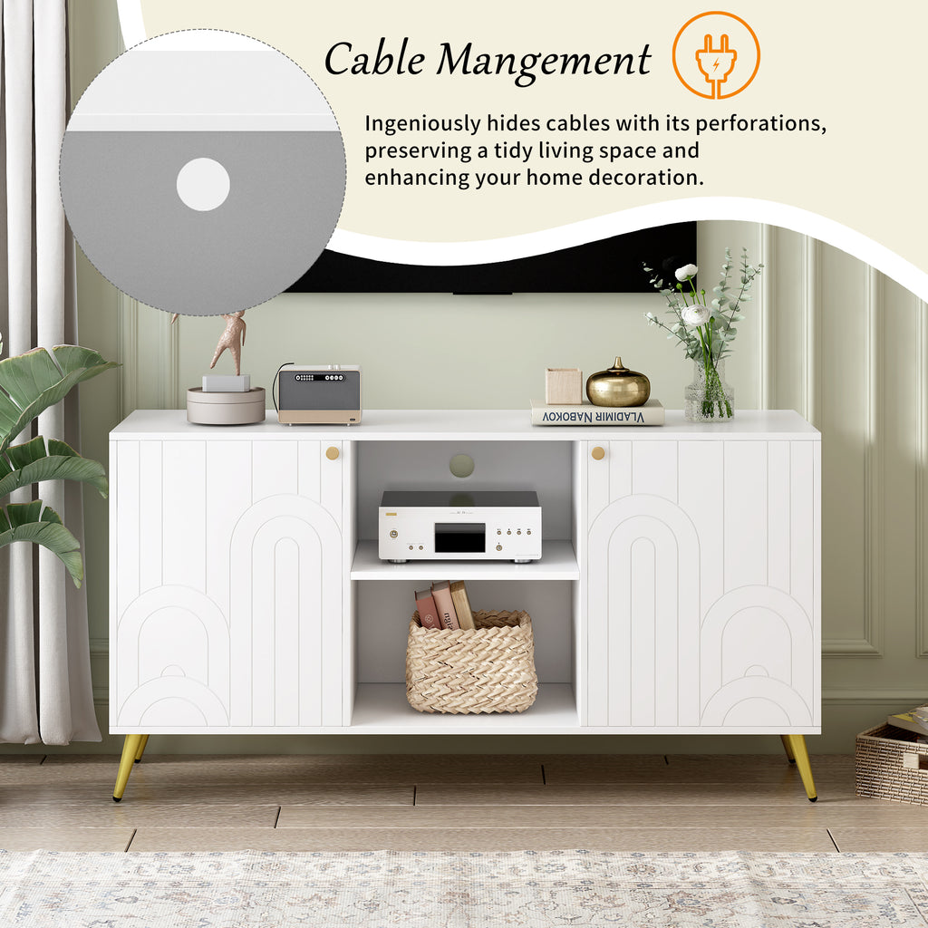 - Featuring two exquisite cabinet doors, this TV stand effectively conceals and protects your storage items, keeping the interior of the unit clean and orderly. The cabinet doors also add a touch of elegance, enhancing the overall taste of your home decor. Additionally, the stand includes two open shelves, providing ample space for storing DVDs, gaming consoles, audiovisual equipment, and other media accessories.