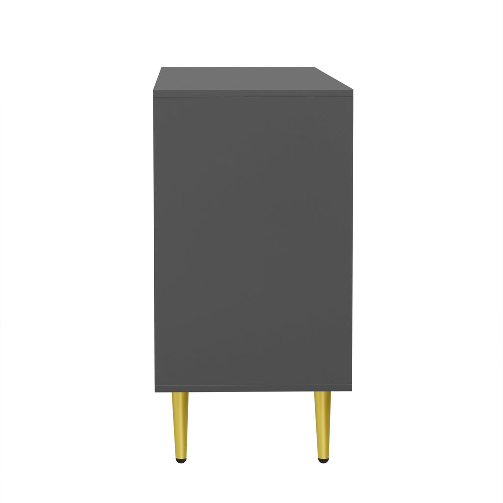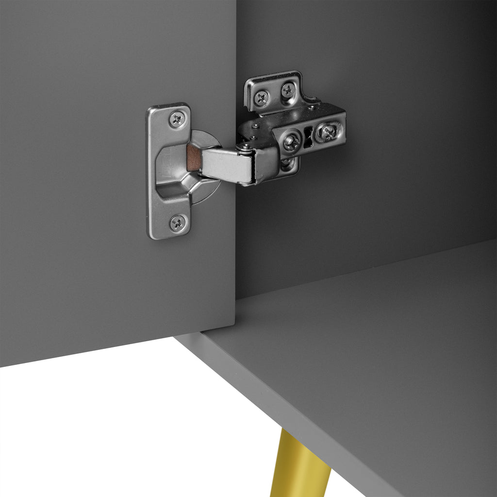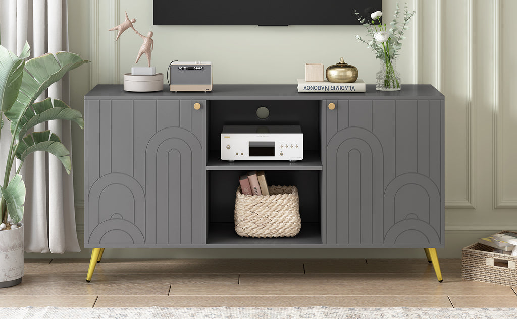 Crafted with meticulous craftsmanship and an eye for simplicity and elegance, this TV cabinet seamlessly integrates into modern living spaces, showcasing an exquisite design that harmoniously blends functionality and style. Featuring premium gray panels and supported by sturdy golden metal legs, it embodies a sophisticated and timeless aesthetic that complements a variety of decor styles, adding a luxurious touch to your living space. The ample two-door storage compartment, equipped with sleek, easy-to-open handles, efficiently accommodates audio-visual equipment, daily essentials, and more, while the central partition, with its layered design, introduces versatility and functionality, serving as both a display area and additional storage space. Furthermore, the cabinet boasts an adjustable shelf, allowing you to customize the storage layout to suit your needs, fostering order and aesthetics in your living room. Additionally, it includes anti-tip device at the back for added safety, ensuring peace of mind and stability in your home environment.