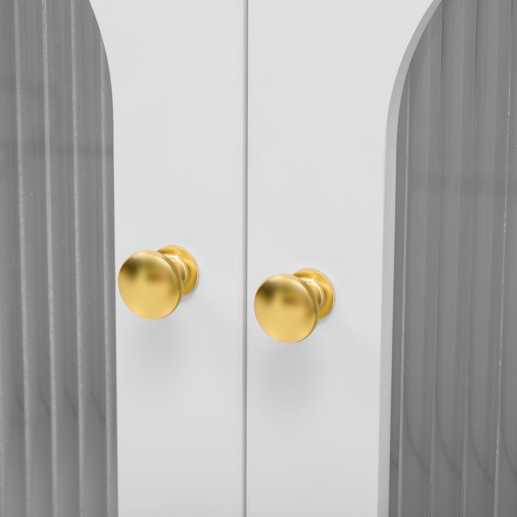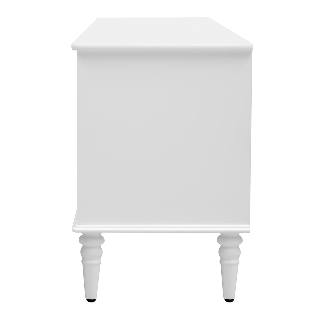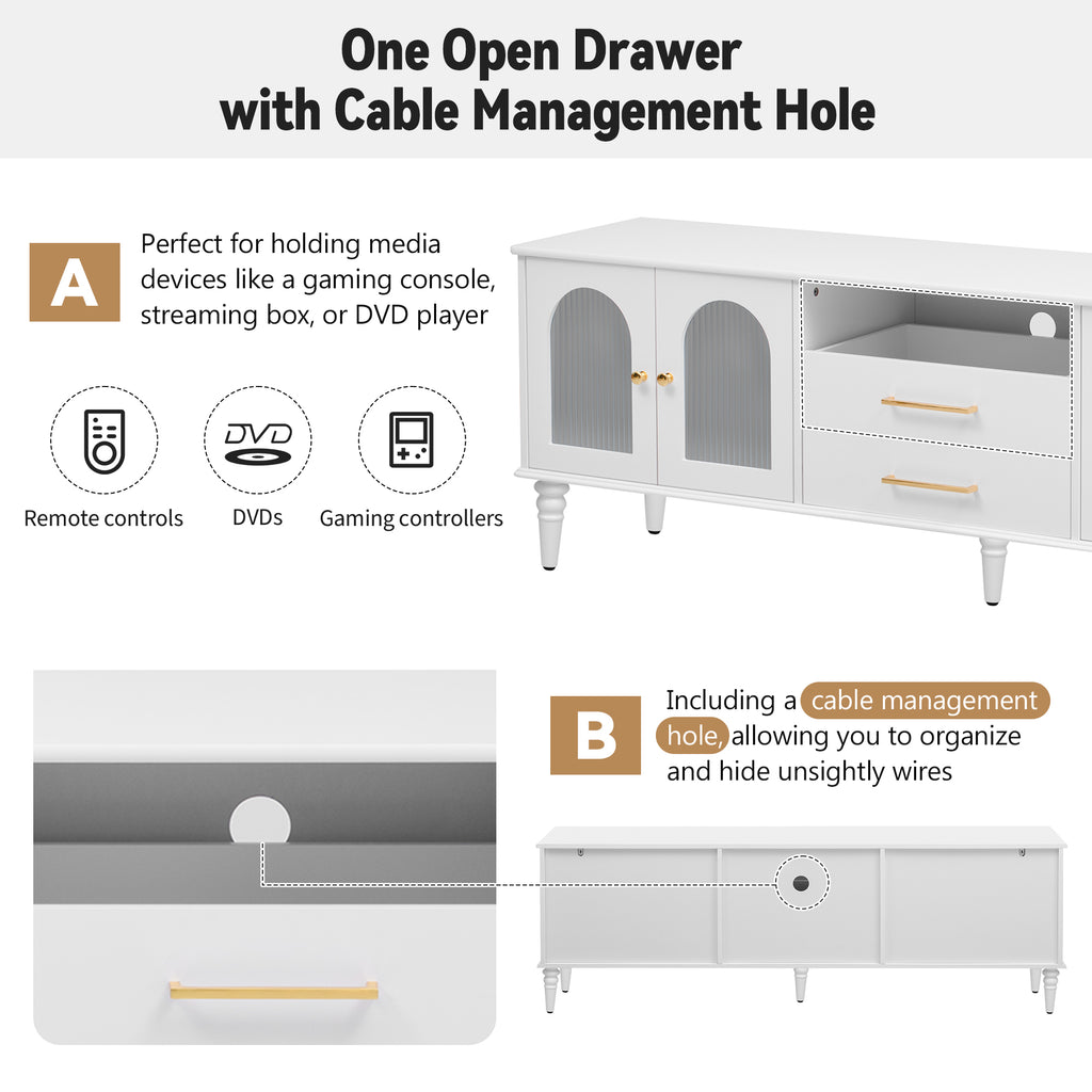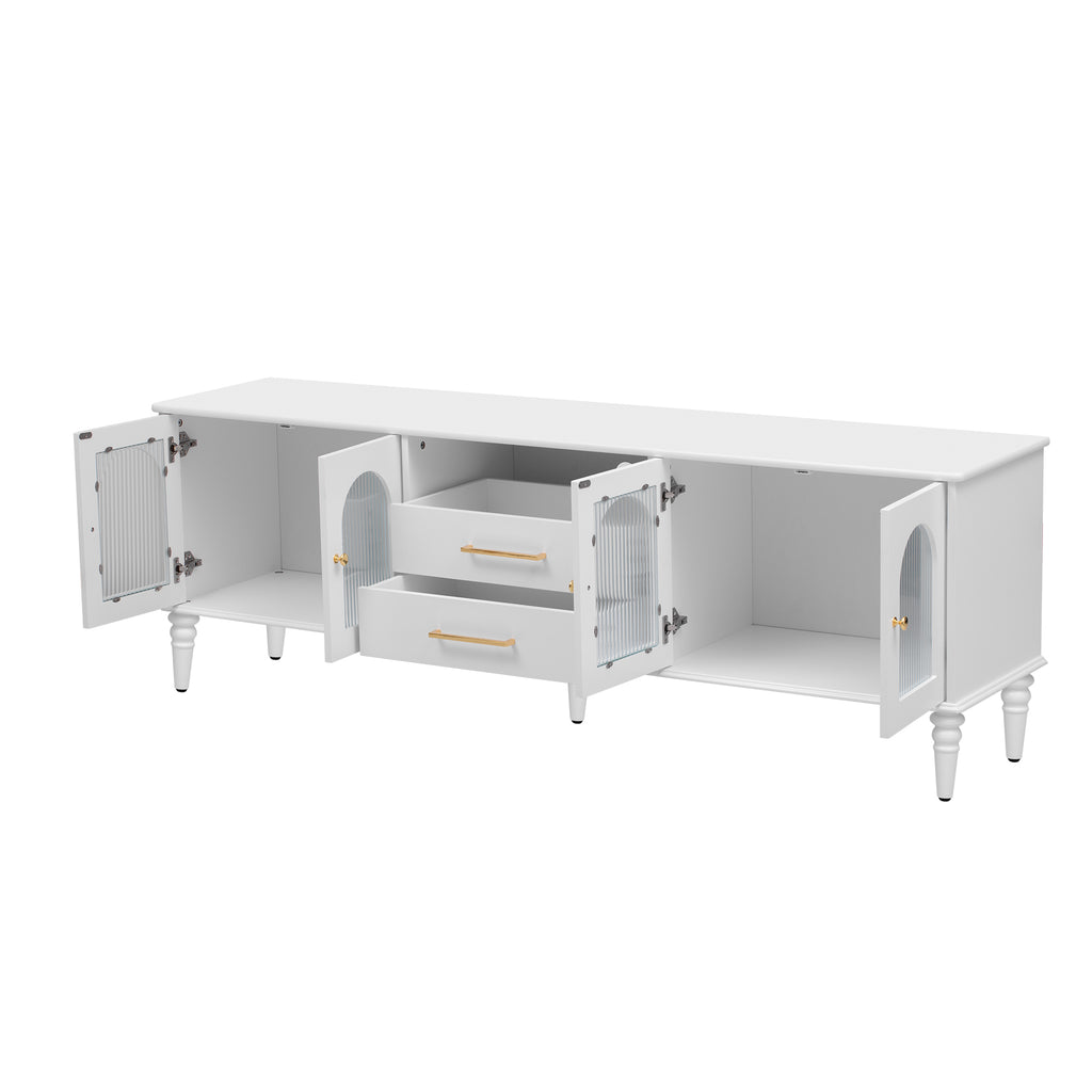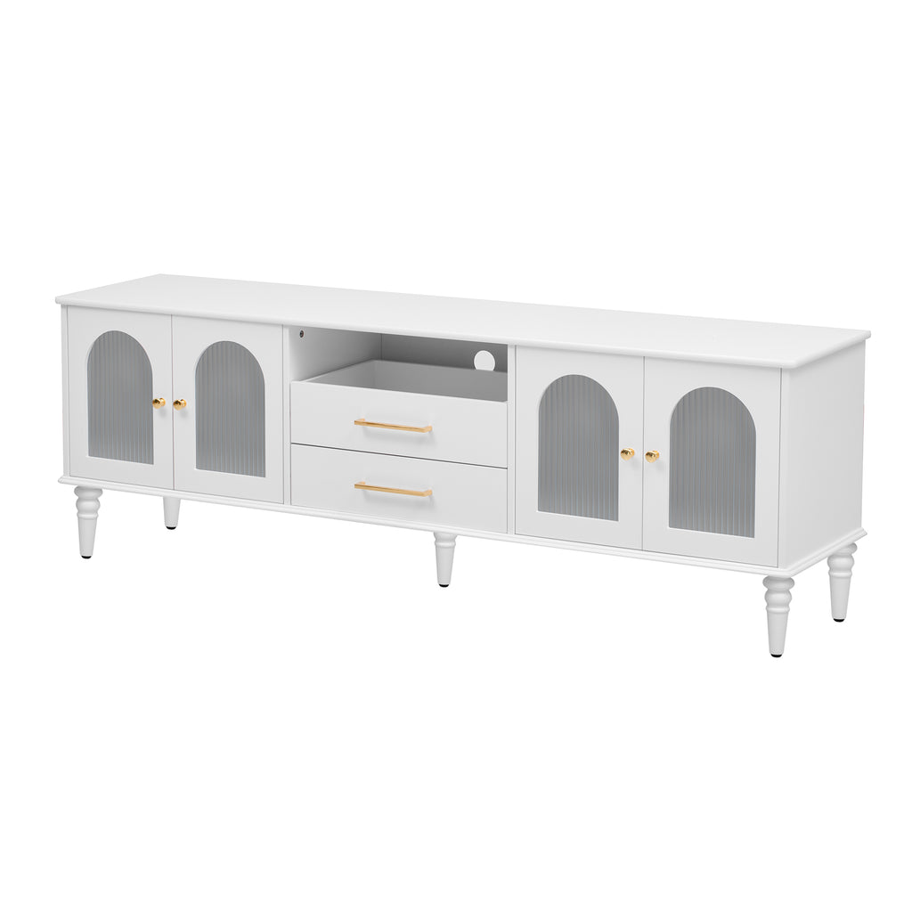 If you're looking for a TV stand that effortlessly blends vintage charm with modern functionality, this retro-inspired piece is the ideal choice. Designed for TVs up to 75 inches, it combines the best of classic and contemporary styles, making it the perfect centerpiece for any living room. With thoughtful details like the arched cabinet doors, Fluted glass, and solid wood Roman column legs, this TV stand is both functional and aesthetically pleasing. And it comes with two sapcious cabinets and drawers to make it a versatile and stylish choice for any home.