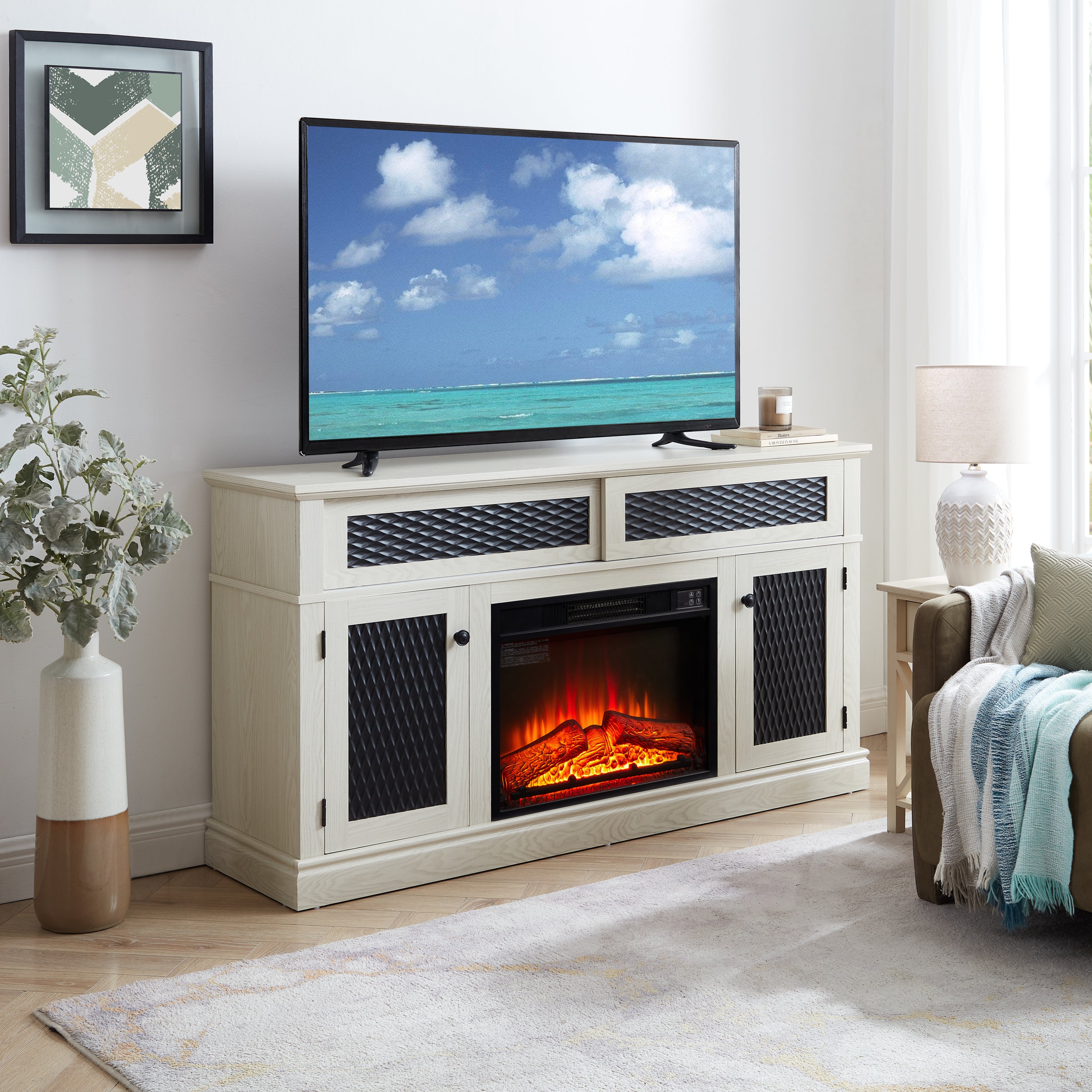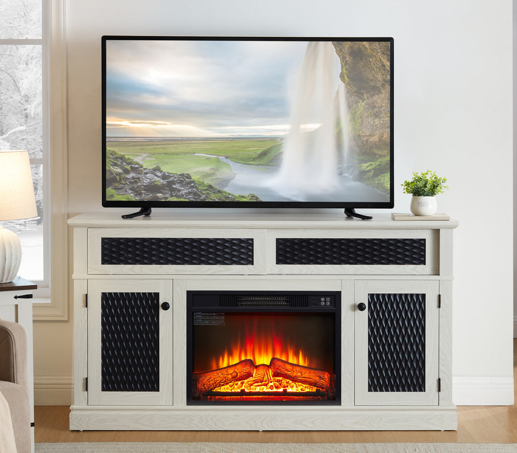 Fits TV up to 65''. Open shelves are great for consoles and gadgets. Embossed pattern making it a perfect fit for any cozy or farmhouse-style decor.