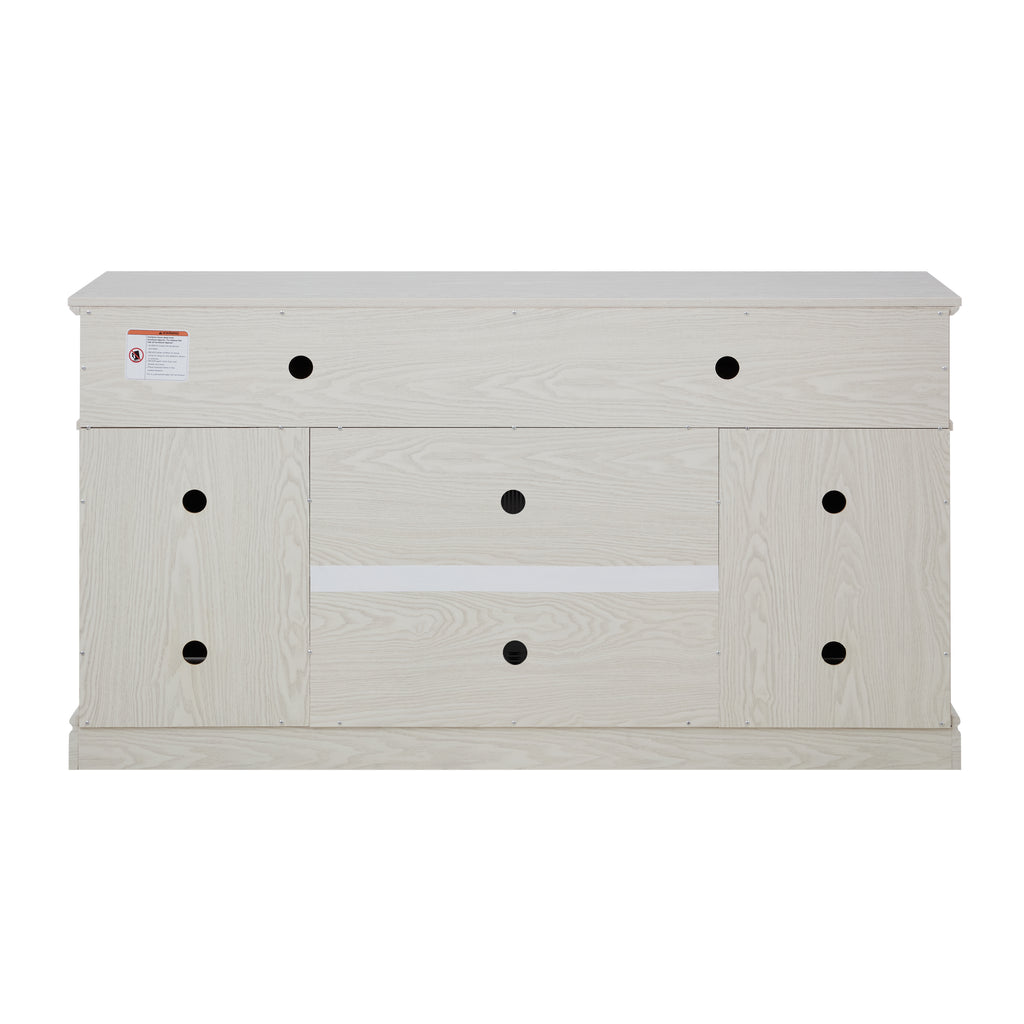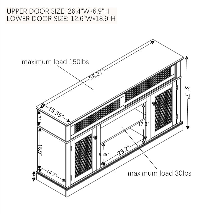 TV Stand Dimensions: 58.27'W*15.35'W*31.7H Largest TV Size: 65'' Body Color: OAK Material: MDF + PB Number of Cable Management Cutouts: 8 Number of Adjustable Shelfs: 3 Fireplace Power Rating: 1,400 W / 4,777 BTU Temperature Setting: 62℉to 82℉ Fireplace Timer Setting: 30 minutes – 6 hours Flame Brightness Levels: 3